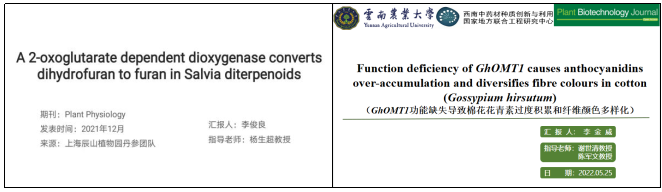 在此次学术活动报告会上,李金威以“Function deficiency of GhOMT1 causes anthocyanidins over-accumulation and diversifies fibre colours in cotton(Gossypium hirsutum)”为题,汇报了天然彩色棉(NCC)纤维具有低碳排放和环保的特点。原花青素(PAs)及其衍生物被认为是纤维着色的主要成分。本研究发现T-DNA插入引起的陆地棉紫色变异体(HS2)中GhOMT1的缺失与非甲基化花青素的过量积累和花青素的甲基化被阻断有关。HS2和NCC的杂交后代通过上调GhANR和GhLAR,增加了其纤维中的PAs水平,产生多种纤维颜色的新品系。在此基础上,提出了通过促进PA生物合成来培育多种NCCs的新策略。本研究将有助于阐明PA的生物合成机制,并为提高NCCs中PA水平提供潜在的分子育种策略。