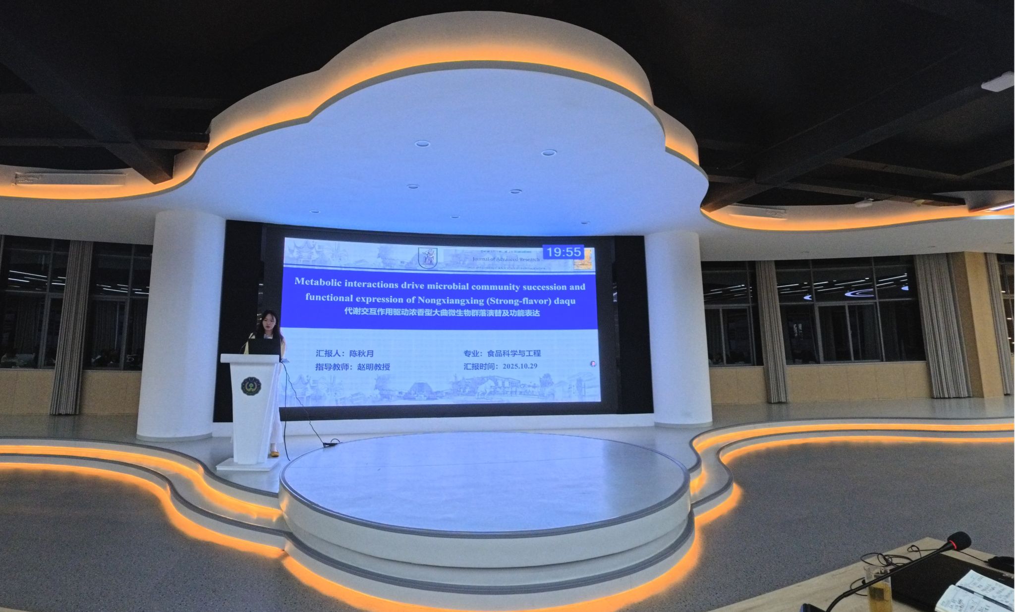 陈秋月博士以“Metabolic interactions drive microbial community succession and functional expression of Nongxiangxing (Strong-flavor) daqu”为题,分享了整合宏基因组与宏蛋白质组学技术,揭示浓香型大曲贮藏过程中微生物群落演替及代谢功能表达的动态机制。研究发现,微生物互作(交叉喂养与代谢分工)是驱动生化功能的核心因素。具体表现为:交叉喂养网络以Weissella confusa为核心,其向系统发育远缘的Kroppenstedtia eburnea和Saccharopolyspora rectivirgula提供氨基酸、辅酶衍生物及碳水化合物,形成代谢依赖关系。贮藏期间共鉴定14,588种蛋白质(含6,801种功能酶),主要富集于碳水化合物与氨基酸代谢通路。酶活性呈阶段性变化——首月急剧下降,第3月达最低值,第4月部分回升;真菌-细菌代谢分工(MDOL) 主导底物转化:真菌(如Rasamsonia、Aspergillus)负责淀粉/纤维素初级降解,细菌接力转化中间产物合成乙酸乙酯、四甲基吡嗪等风味物质;群落结构呈现"先增后稳"趋势,优势菌通过功能互补适应贮藏环境。该成果阐明微生物互作(而非单一群落组成)决定大曲风味形成,为优化贮藏工艺、缩短生产周期提供理论依据。
