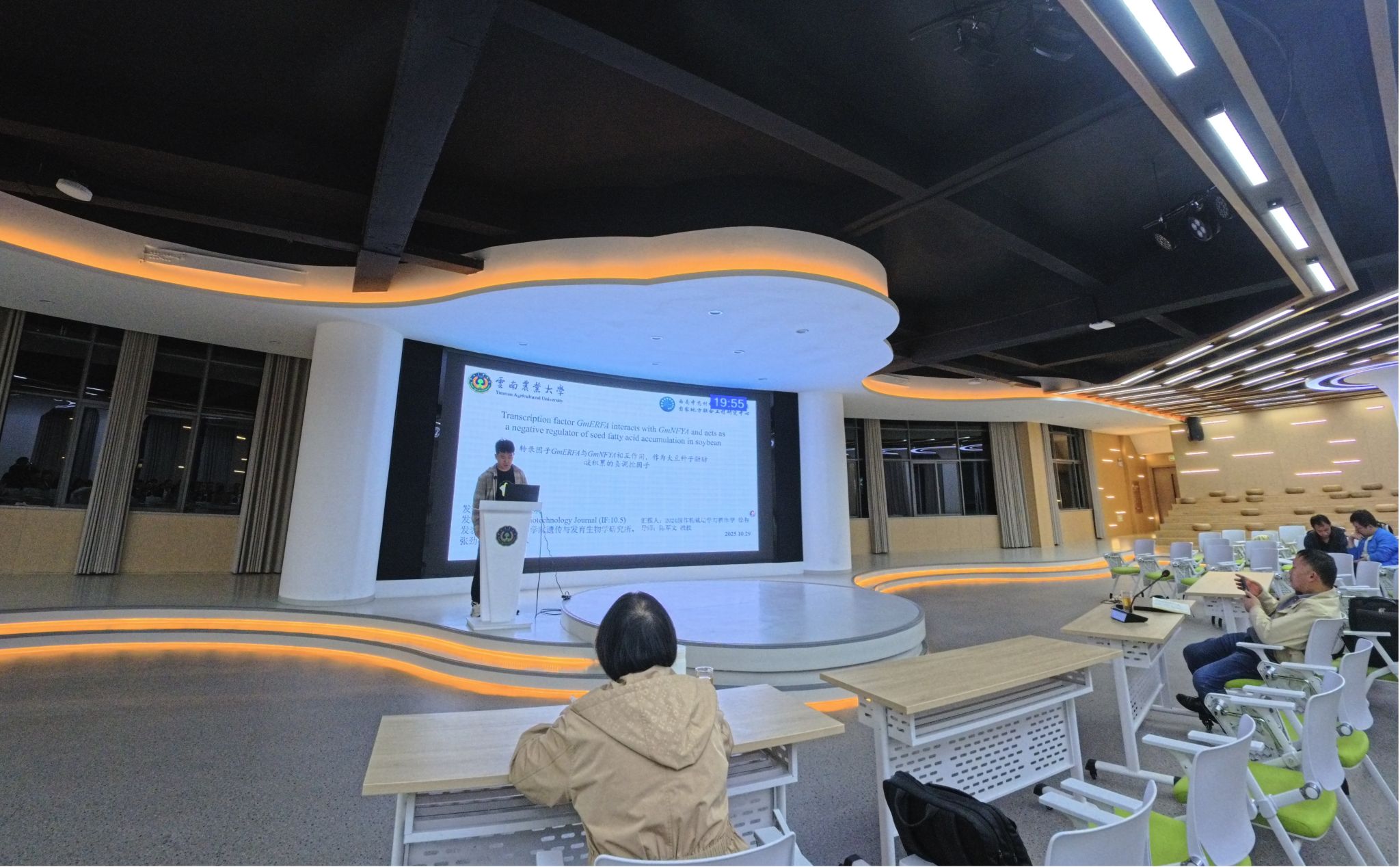 徐哲博士以“Transcription factor GmERFA interacts with GmNFYA and acts as a negative regulator of seed fatty acid accumulation in soybean”为题,介绍了大豆种子油脂积累调控机制的研究进展。大豆作为重要油料作物,其种子含油量直接影响经济价值与工业适用性,但相关调控机制尚不明确。研究通过RNA-seq分析和筛选正性油脂调节剂GmNFYA的相互作用蛋白,鉴定出AP2/ERF型转录因子GmERFA,发现其为油脂积累的负调控因子。基因组编辑敲除GmERFA及其同源物可提高种子总脂肪酸含量,而过表达GmERFA则导致脂肪酸水平下降。GmERFA与GmNFYA相互作用,抑制GmbZIP123和GmZF392的转录激活,二者均为促进种子油脂积累的关键因子。此外,GmERFA直接结合GmbZIP123和GmZF392的启动子区域并抑制其表达。通过对300余份大豆种质的分析,鉴定出具有Hap3启动子的ERFA优良等位基因,其启动子活性较低、基因表达水平下降,但种子油含量较高。该等位基因在大豆驯化过程中被选择并固定。研究揭示了一个油脂积累的“制动”基因,并提出其在大豆种子发育后期通过GmERFA-GmNFYA-GmbZIP123/GmZF392 分子网络发挥作用,为高油大豆育种提供了新靶点。