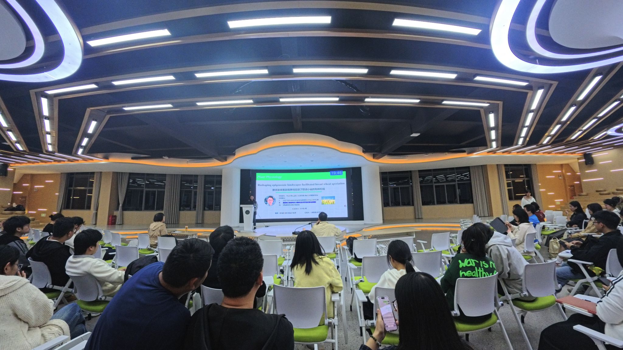 学术活动报告会上,朱悦悦博士以“Reshaping epigenomic landscapes facilitated bread wheat speciation”为题,阐述了整合RNA-seq、CUT&Tag与ATAC-seq技术对乌拉尔图小麦、粗山羊草、野生二粒小麦、硬粒小麦及普通小麦的叶、穗、根组织进行多组学分析,构建了高分辨率表观基因组与转录组图谱。研究显示,在小麦六倍化过程中,源自DD亚基因组的原显性基因其活跃组蛋白修饰(H3K27ac、H3K4me3)水平下降,其表达量与A、B亚基因组同源基因趋于平衡,表明表观修饰变化有助于基因组稳定。研究还系统鉴定了由H3K27ac和H3K4me3标记的远端顺式调控元件(dCRE),发现其富集于QTL和eQTL区域,序列变异可影响调控活性并导致表型差异。例如,TaDEP-B1的Hap1型dCRE增强其表达并提高穗粒数。进一步分析揭示,表观修饰与DNA变异共同驱动转录因子结合位点的协同进化,六倍体小麦中ERF家族结合位点扩张并形成协同调控网络。功能验证表明,ERF家族成员WFZP可结合TaSPL14-A1启动子开放区,激活其表达并调控穗发育。