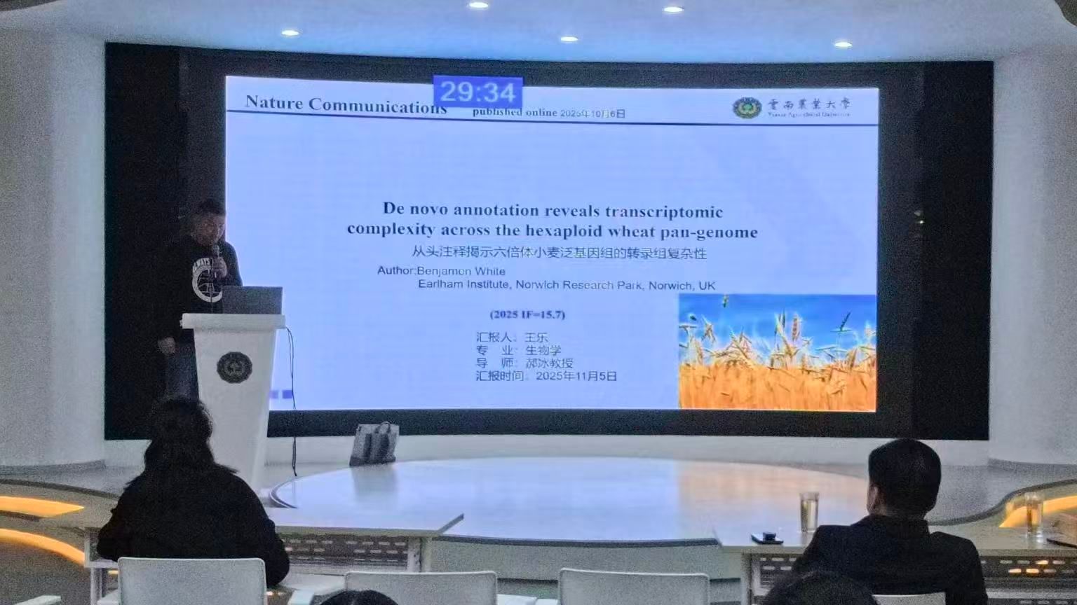 王乐博士以“De novo annotation reveals transcriptomic complexity across the hexaploid wheat pan-genome”为题进行文献分享报告。该文献研究利用9个组装到染色体水平的小麦品种的基因组进行从头注释,揭示了小麦泛基因组内的遗传多样性和复杂性。识别出了品种特异性基因,并定义了核心基因组和非必需基因组。对不同品种和组织的泛转录组的表达分析显示,大量核心同源基因的表达具有保守性,不同品种间亚基因组同源基因的表达偏倚存在变化,且存在品种特异性表达谱。作者利用新构建的基于基因的小麦泛基因组和泛转录组,展示了不同品种间醇溶蛋白超家族和免疫反应蛋白的变异,为小麦品种的选育提供了可靠的参考。