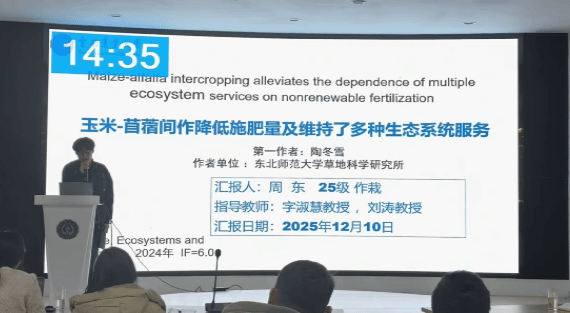 周东硕士以“Maize-alfalfa intercropping alleviates the dependence of multiple ecosystem services on nonrenewable fertilization”为题进行文献分享报告。本研究以玉米/苜蓿间作为研究对象,通过为期五年的田间试验,探究了施磷水平和种植模式对多种生态系统服务的影响。结果表明,相比于施磷条件的单作,在玉米/苜蓿间作体系中不施磷提高了多种生态系统服务;玉米/苜蓿间作缓解了作物生产力和土壤生物多样性的权衡效应;玉米/苜蓿间作在施磷量降低的条件下,仍然可以维持多种生态系统服务。该研究为可持续农业提供了理论支持,表明玉米/苜蓿间作是一种有效的策略,可在减少不可再生肥料使用的同时,维持农田生态系统的多功能性,对保障粮食安全和生态可持续性具有重要意义。
