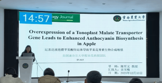 吉玉梅硕士以“Overexpression of a Tonoplast Malate Transporter Gene Leads to Enhanced Anthocyanin Biosynthesis in Apple”为题进行文献分享报告。该研究系统的解析了在苹果中过量表达液泡膜苹果酸转运蛋白基因Ma1的编码序列会通过反馈抑制机制下调转录因子MdMYB73的表达。MdMYB73不仅能正向调控果实酸度相关基因(如Ma1),其下调同时解除了其对花青素合成最后一步关键酶基因MdUFGT的转录抑制。此外,MdMYB73与花青素正向调控因子MdMYB1竞争性结合MdUFGT启动子上的相同MYB位点。因此,cMa1-OE通过降低MdMYB73水平,间接促进MdUFGT表达及MdMYB1的结合效率,最终显著增强果皮花青素生物合成,揭示了果实酸度与色泽协同调控的新分子机制。