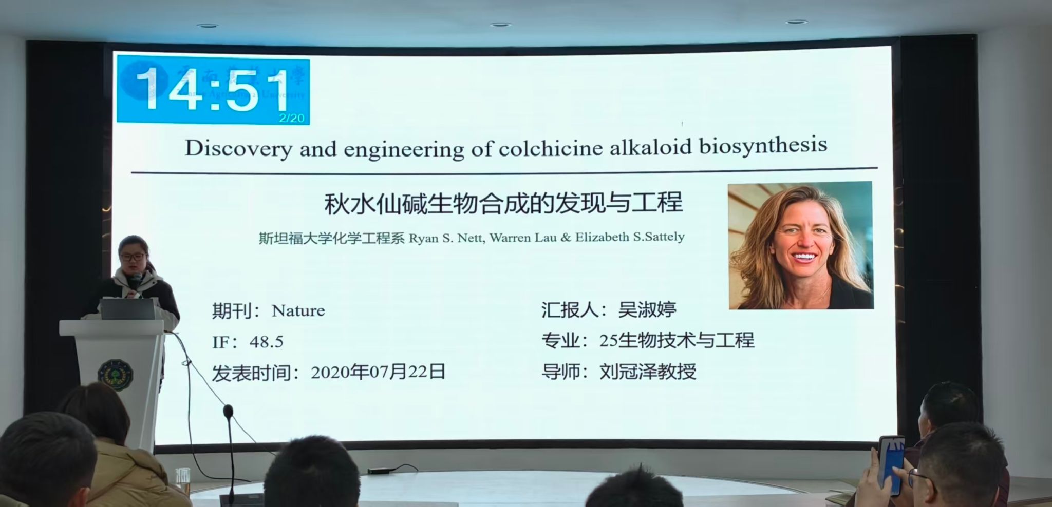 在此次学术活动报告会上,吴淑婷硕士以“Discovery and engineering of colchicine alkaloid biosynthesis ”为题进行文献分享报告。该研究以嘉兰为对象,结合了转录组学、代谢组学以及通路重构等方法阐明了秋水仙碱的近乎完整的生物合成途径。从嘉兰中鉴定了8个基因,用于合成N-甲酰秋水仙胺,其是一种秋水仙素前体,含有秋水仙碱特有的环庚三烯酚酮环和药效团。该研究还发现了一种催化产生秋水仙碱独特碳骨架所需的扩环反应的非经典细胞色素P450。进一步利用新发现的基因,在本氏烟草中重构了从苯丙氨酸和酪氨酸出发合成N-甲酰秋水仙胺的途径(含有16个基因)。这项研究为生物合成含环庚三烯酚酮骨架的秋水仙碱类化合物建立了一条有效的代谢途径,并为植物体将简单氨基酸转变为复杂天然产物过程中所涉及到的一些独特化学反应提供了见解。