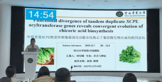 贺佳蝶硕士以“Functional divergence of tandem duplicate SCPL acyltransferase genes reveals convergent evolution of chicoric acid biosynthesis”为题进行文献分享报告。该研究报道了莴苣中一条替代生物合成途径。BAHD酰基转移酶催化绿原酸的合成,后者作为酰基供体作用于四个由串联重复基因编码的丝氨酸羧肽酶样(SCPL)酰基转移酶(LsSCPL1-4)。LsSCPL2和LsSCPL4以咖啡酒石酸为酰基受体催化菊苣酸的合成。与在紫锥菊物种中发现的BAHD酰基转移酶不同,LsSCPL1和LsSCPL3通过关键氨基酸替换改变其底物偏好性,以酒石酸为酰基受体合成咖啡酒石酸。这些串联重复的SCPL基因在菊苣族多个物种中均被观察到。这些发现揭示了菊科植物中菊苣酸生物合成的趋同进化,并凸显了植物特殊代谢中酰基转移酶活性的复杂性。