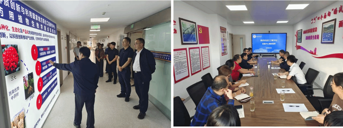 本站消息:2025年10月11日,校党委王卫斌书记一行莅临西南中药材种质创新与利用国家地方联合工程研究中心(以下简称“中心”)调研指导。中心主任杨生超、副主任陈军文等中心主要工作人员陪同调研。