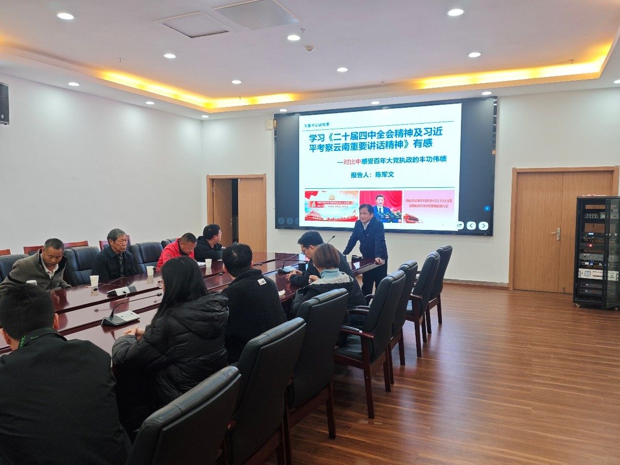 中药材支部书记陈军文教授以“学习二十届四中全会精神暨习近平考察云南重要讲话精神:对比中感悟百年大党执政的丰功伟绩”为题,为中药材支部党员和寻甸县倘甸镇中庆社区、海子村委会的基层党员讲授专题党课。陈军文采用“理论阐释+数据支撑”的方式,系统解读《中共中央关于制定国民经济和社会发展第十五个五年规划的建议》核心要义,全面梳理“十四五”时期我国发展取得的重大成就,并对“十五五”规划发展蓝图进行深入解读。