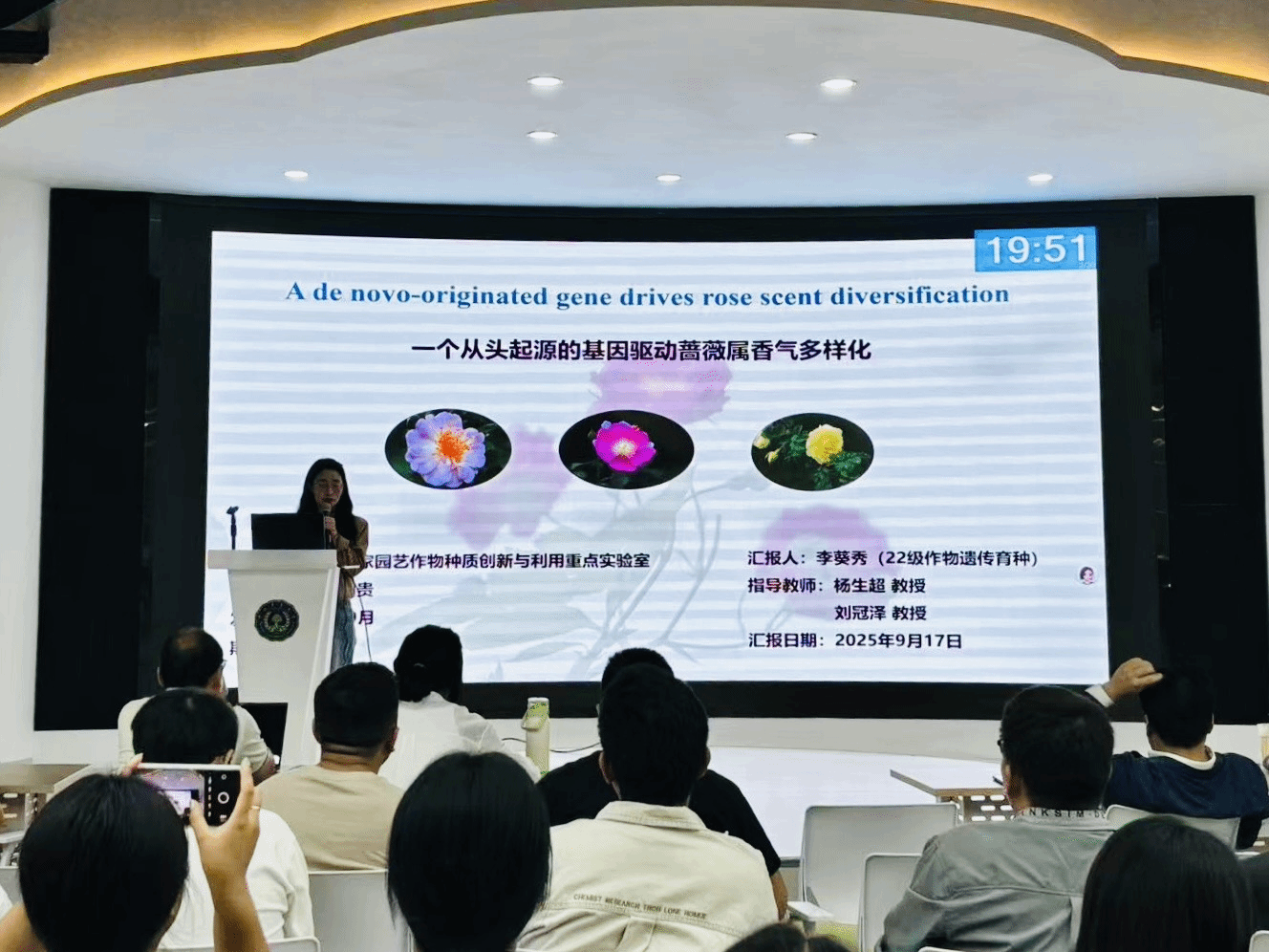 在学术报告会上,李葵秀博士以“Engineered yeast provides rare but essential pollen sterols for honeybees”为题进行文献分享报告。该文献研究发现SCREP是蔷薇属特有序列限制基因,经多步演化形成:先出现exon2,再逐步产生exon1和内含子,MITE转座子插入启动子区显著提高其表达。功能验证显示,SCREP作为转录因子,通过调控苯丙烷途径关键酶基因,抑制丁香酚合成。该基因在晚分化蔷薇物种中稳定遗传,其存在与否及表达差异,是导致不同玫瑰物种和品种香气差异的关键因素,这为玫瑰花香定向育种提供重要靶点。
