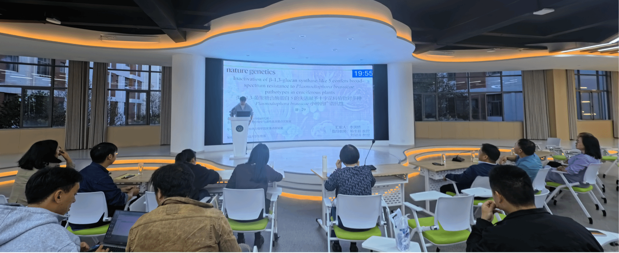在学术报告会上,李满桥博士以“Inactivation of β-1,3-glucan synthase-like 5 confers broad-spectrum resistance to Plasmodiophora brassicae pathotypes in cruciferous plants”为题进行文献分享报告。该研究通过对244份重测序的甘蓝型油菜(Brassica napus)进行连续3年的田间根肿病表型全基因组关联分析,发现β-1,3-葡聚糖合酶样基因5(GSL5)与根肿病易感性显著相关。GSL5在进化上高度保守,通过在拟南芥、甘蓝型油菜、白菜和甘蓝中利用基因组编辑技术失活GSL5,可赋予对根肿菌多个小种的广谱高抗性,且在甘蓝型油菜中不引起产量损失。GSL5失活会解除根肿菌二次侵染阶段对茉莉酸信号通路免疫响应的抑制;根肿菌效应子可能通过稳定GSL5蛋白以增强这种免疫抑制,从而促进病害发生。该研究为十字花科根肿病防控提供了持久的抗性基因资源,并为植物抵抗真核病原菌的机制提供了新见解。