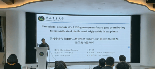 杨雁涵硕士以“Functional analysis of a UDP-glucosyltransferase gene contributing to biosynthesis of the flavonol triglycoside in tea plants”为题进行文献分享报告。该研究在对原变种和普洱茶变种代表性品种不同叶位样品转录组和代谢物分析的基础上,以WGCNA分析获得黄酮醇三糖苷合成相关候选基因CsFGT,并通过基因克隆、重组酶底物特异性和动力学分析、分子对接和定点突变、以及反义寡核苷酸(AsODN)抑制等一系列实验,明确了茶树CsFGT基因功能及其表达与Q-g-r-g含量的关系,为不同变种黄酮醇苷差异积累机制阐明奠了基础。