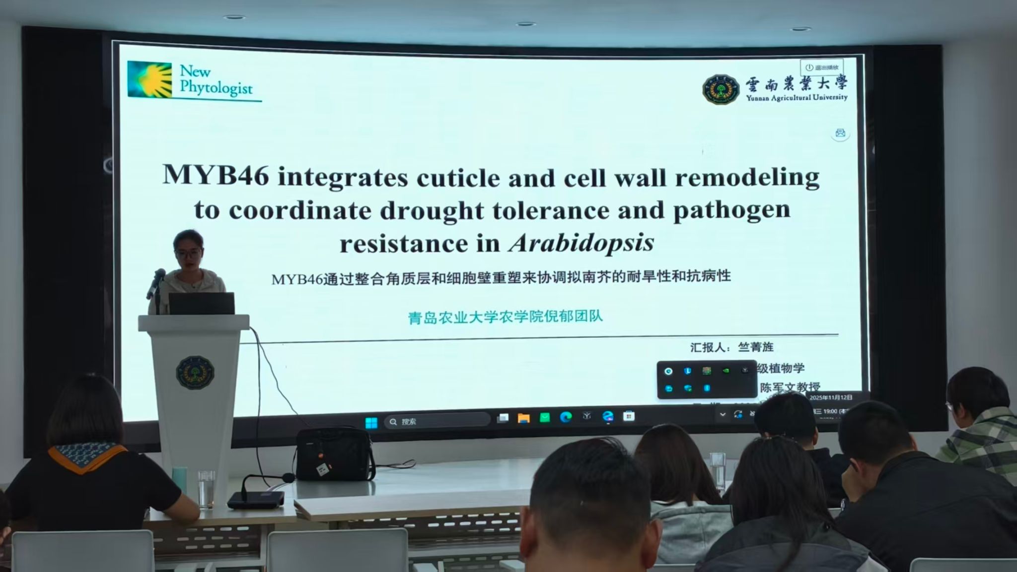 在此次学术活动报告会上,竺菁旌硕士以“MYB46 integrates cuticle and cell wall remodeling to coordinate drought tolerance and pathogen resistance in Arabidopsis ”为题进行文献分享报告。该研究以拟南芥为对象,揭示了MYB46不仅是已知的次生细胞壁生物合成调控因子,还通过直接激活LACS1、LACS2、KCS1、KCS19、CER1等角质层生物合成基因,调控角质层的形成与渗透性;MYB46 功能缺失突变体(myb46-3、myb46-4)角质和蜡质积累减少、角质层渗透性增强,虽然通过上调防御相关基因(如 PERs、PAD3)提高对灰葡萄孢菌(Botrytis cinerea) 的抗性,但耐旱性降低;而 MYB46 过表达株系则增强角质层完整性、增加角质和蜡质积累,提升耐旱性且不影响病害敏感性,最终证实 MYB46 是整合角质层与细胞壁重塑、协调拟南芥干旱耐受性和病原菌抗性的双重调控因子。