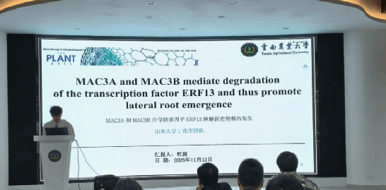 杜波硕士以“MAC3A and MAC3B mediate degradation of the transcription factor ERF13 and thus promote lateral root emergence”为题进行文献分享报告。该研究以转基因拟南芥幼苗为研究对象,揭示了拟南芥中MAC3A 和 MAC3B通过作为 E3 泛素连接酶介导转录因子ERF13的泛素化降解,从而促进侧根突出的分子机制:生长素激活MPK14,使其磷酸化 ERF13 以增强其与 MAC3A/3B 的相互作用;同时生长素通过ARF7/19间接上调 MAC3A/3B 的转录并增强其蛋白稳定性,促使二者在侧根原基(LRP)中积累;最终 MAC3A/3B 介导的ERF13 降解解除了后者对 LRP 从 IV 期向 V 期过渡的抑制,推动侧根发生。