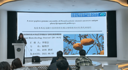李朝会硕士以“A near-gapless genome assembly of Pseudocydonia sinensis uncovers unique phenylpropanoid pathways”为题进行文献分享报告。该研究通过对光皮木瓜高质量的单倍型基因组的组装与比较基因组学分析,揭示了其在全基因组复制事件后的核型进化轨迹及与次级代谢物合成相关基因家族的扩展。代谢组与转录组的整合分析进一步揭示,MYB转录因子ODORANT(PsMYBODO1)是苯丙素代谢的关键调控因子,可直接结合并激活包括PsRT3、PsPAL、PsCAD、PsCOMT在内的多个核心代谢基因的启动子。该该研究报道的光皮木瓜的首个高质量基因组组装为解析其药用价值和开展分子育种奠定了重要基础。
