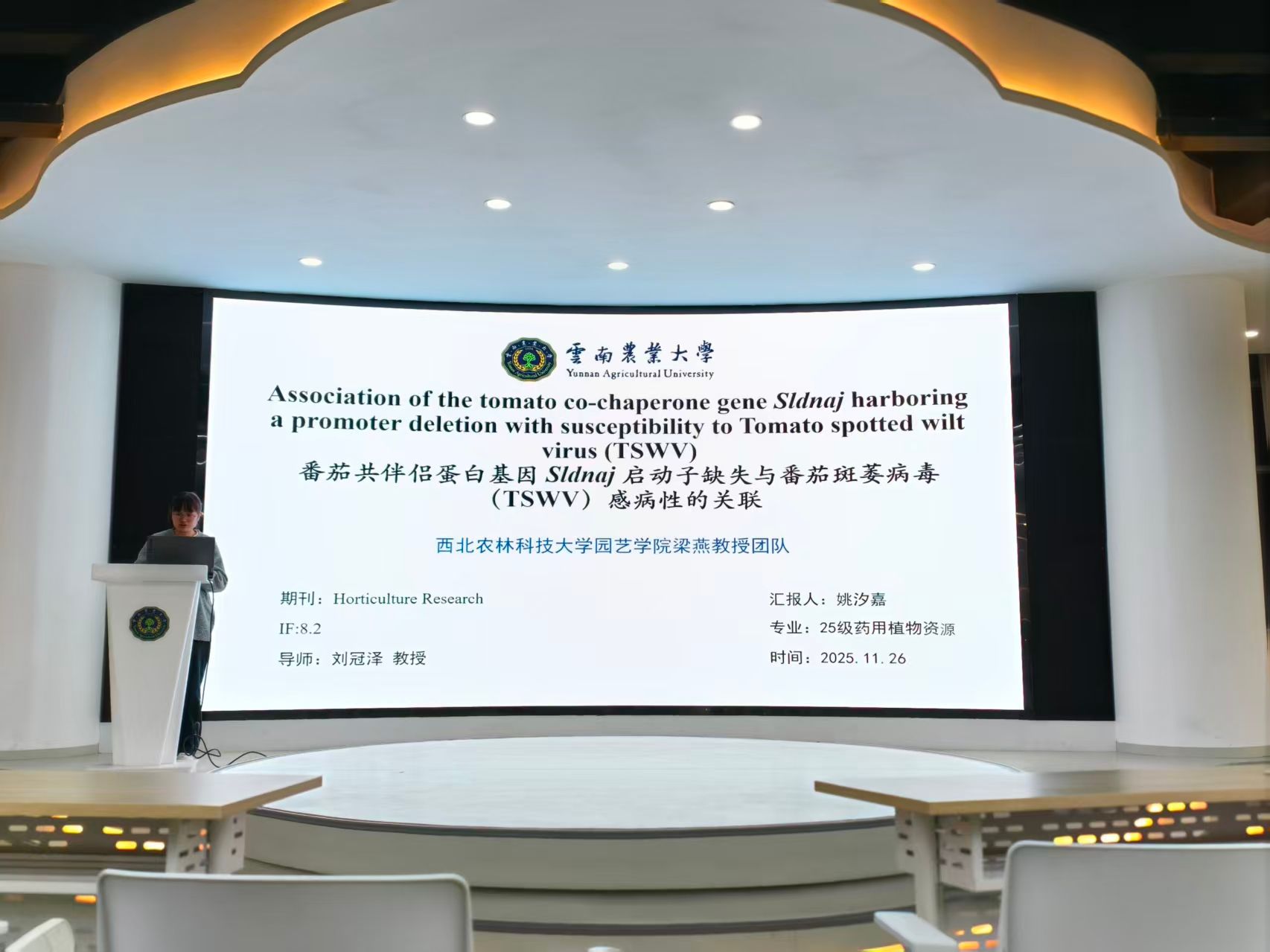 在此次学术活动报告会上,姚汐嘉硕士以“Association of the tomato co-chaperone gene Sldnaj harboring a promoter deletion with susceptibility to Tomato spotted wilt virus (TSWV)”为题进行文献分析报告。该文献阐述了番茄斑萎病毒(TSWV)对全球番茄(Solanum lycopersicum)的产量和品质构成严重威胁。挖掘番茄种质中新型抗性基因是防控TSWV的有效且环境友好策略。本研究针对一株不携带任何已知TSWV抗性基因但实验接种后表现高抗性的番茄品系,通过构建不同遗传群体及批量分离分析测序(BSA-seq),精细定位了抗病性状的候选基因,发现SlDnaJ(Solyc10g081220)为潜在调控TSWV抗性的关键位点。进一步分析表明,易感番茄种质M82中SlDnaJ的启动子区域存在61 bp序列缺失的结构变异(命名为Sldnaj)。Sldnaj基因敲除的转基因植株对TSWV的抗性显著高于野生型植株。Sldnaj的上调表达通过干扰水杨酸/茉莉酸(SA/JA)信号通路,诱导并促进TSWV在M82易感植株中的系统侵染。该研究鉴定了一个具有自然缺失变异的番茄TSWV易感性新候选基因,为解析植物抗病分子机制及番茄抗TSWV育种提供了新靶点。