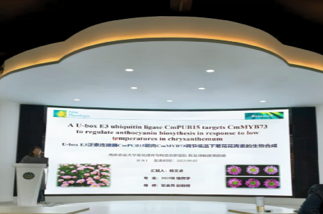 杨文卓硕士“ A U-box E3 ubiquitin ligase CmPUB15 targets CmMYB73 to regulate anthocyanin biosynthesis in response to low temperatures in chrysanthemum”为题进行文献分析报告。该文献阐述了在每年的菊花生产过程中,低温(10℃,下同)可以促进花瓣中花青素的积累。然而,这一现象背后的具体机制尚不清楚。在该研究中发现SG22 R2R3-MYB转录因子CmMYB73是菊花花青素生物合成的负调控因子。CmMYB73在转录和蛋白质水平上以相反的方式响应低温。进一步的研究表明,U-box E3泛素连接酶CmPUB15与CmMYB73相互作用,并在转录水平上被低温显著上调。CmMYB73被CmPUB15泛素化,随后通过26S蛋白酶体途径降解,导致菊花花瓣中花青素的积累。该研究发现概述了低温下花青素生物合成的新途径,并为提高菊花花青素含量的分子育种工作提供了见解。