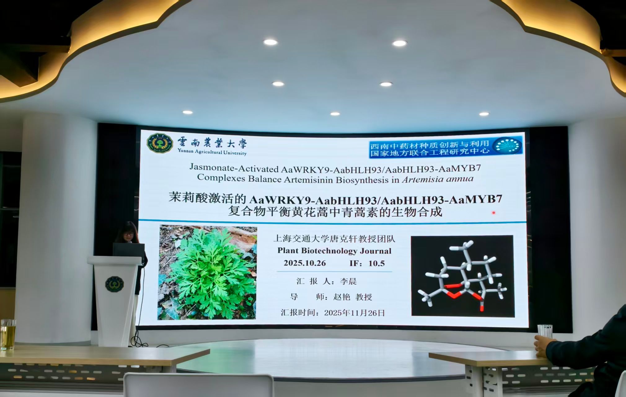 李晨硕士“Jasmonate-Activated AaWRKY9-AabHLH93/AabHLH93-AaMYB7 Complexes Balance Artemisinin Biosynthesis in Artemisia annua”为题进行文献分析报告。该文献阐述了为解析光照与JA信号协同调控青蒿素合成的分子机制,聚焦AaWRKY9、AabHLH93等核心因子,通过转基因、HPLC、qRT-PCR及蛋白互作/DNA结合实验验证。结果表明,AabHLH93与AaWRKY9在细胞核内形成激活复合物,特异性结合AaCYP71AV1等合成基因启动子的E-box3,激活其表达并促进青蒿素合成;AaJAZ9(JA抑制因子)结合AaWRKY9、AaMYB7竞争结合AabHLH93,双重阻断复合物形成以抑制合成。光照通过AaHY5诱导AaWRKY9,JA通过降解AaJAZ9释放激活信号,幼叶中激活占优、成熟叶中抑制占优。该研究阐明青蒿素合成的核心调控通路,为黄花蒿高产育种提供靶点。