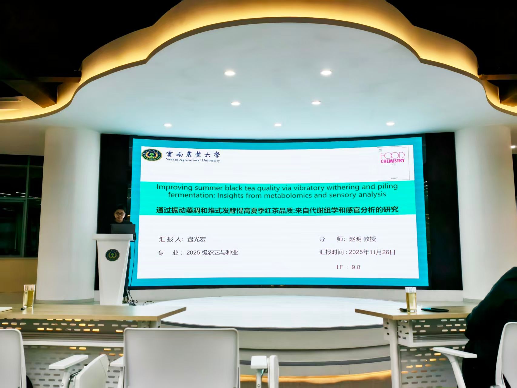 盘光宏硕士以“Improving summer black tea quality via vibratory withering and piling fermentation: Insights from metabolomics and sensory analysis”为题进行文献分析报告。该文献阐述了夏季红茶通常缺乏优质红茶的花果香气,且儿茶素低聚体含量较低,消费者接受度与资源利用率受限。该研究将振动萎凋(VW)、堆积发酵(PF)及其组合工艺(CP)引入传统加工(CK),通过感官评价、理化分析及多组学技术对比。结果显示,组合工艺(CP)效果最优,显著提升茶黄素、茶褐素含量,富集香叶醇、芳樟醇等花果香型挥发性成分。其机制为振动萎凋激活茉莉酸通路,促进萜烯合成与儿茶素氧化;堆积发酵增强类胡萝卜素降解及脂氧合酶(LOX)通路活性。该组合工艺提升了夏季红茶生物活性成分的品质与含量,增强其感官吸引力和商品价值,为夏季红茶品质提升提供了可行方案。