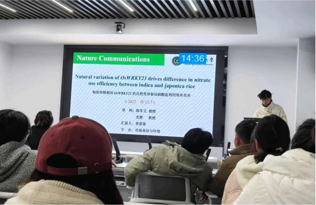 曹嘉豪硕士以“Natural variation of OsWRKY23 drives difference in nitrate use efficiency between indica and japonica rice”为题进行文献分享。该研究将籼稻中的高效硝酸盐利用等位基因导入粳稻,不仅能提高粳稻的氮利用效率,也有助于发现硝酸盐代谢调控中的未知因子。研究鉴定出OsWRKY23是决定籼稻和粳稻硝酸盐吸收及氮利用效率差异的关键基因。与粳稻型相比,籼稻型OsWRKY23等位基因对生长素积累负调控因子DNR1的转录激活能力较弱,导致生长素水平升高,进而促进硝酸盐的吸收与同化,最终提高谷物产量。地理和进化分析表明,OsWRKY23与硝酸盐利用相关性状的分布存在重叠,尤其在低氮土壤区域,表明其可能参与了水稻对低氮环境的适应演化,以优化氮素利用效率并提高产量。将籼稻的OsWRKY23-DNR1调控模块引入粳稻,是提升粳稻氮效率的有效途径,对推进可持续农业具有重要意义。