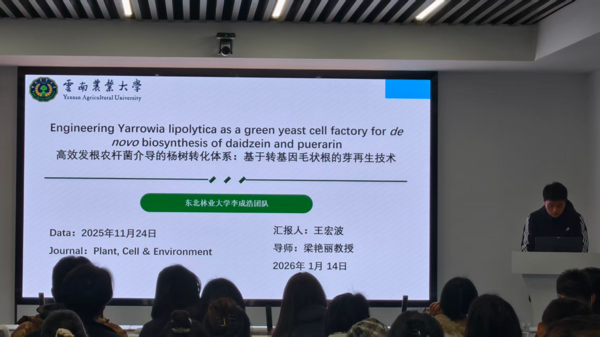在本次学术活动报告会上,王宏波硕士以“Engineering Yarrowia lipolytica as a green yeast cell factory for de novo biosynthesis of daidzein and puerarin”为题进行文献分享报告。该研究围绕杨树为材料,构建了一套适用于乌苏里杨等多个杨树品种的“叶片-K599-荧光筛选”毛状根高效转化体系: 3周即可获得eYGFPuv阳性毛状根,并通过愈伤组织分化、芽伸长及生根过程,在12周内获得完整转基因植株,PCR验证显示外源基因100%稳定整合。在此基础上,研究进一步利用该体系递送CRISPR/Cas9系统敲除基因PuHox52,成功获得双等位突变体。突变体表现出不定根显著减少的表型,与RNAi实验结果一致,证明了该体系具有基因型依赖性低、转化效率高、周期短等优势,可支持杨树快速实现稳定基因组编辑及功能基因鉴定。根癌农杆菌介导的转化与再生体系,为杨树不依赖基因型的荧光筛选及稳定的CRISPR/Cas9基因组编辑提供了可靠平台,有助于推动功能基因组学与分子育种研究。