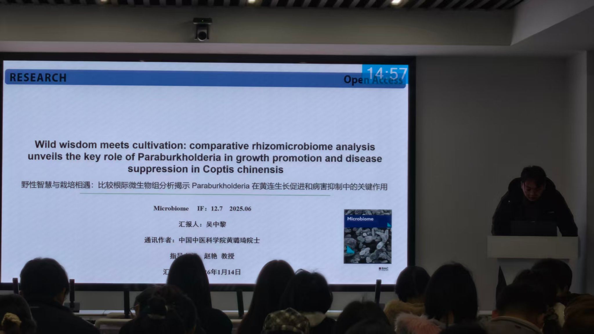 吴中黎硕士以“Wild wisdom meets cultivation: comparative rhizomicrobiome analysis unveils the key role of Paraburkholderia in growth promotion and disease suppression in Coptis chinensis”为题进行文献分享报告。该研究通过高通量扩增子测序,系统比较了栽培与野生黄连根际微生物组成的差异。结果显示,野生黄连根际微生物群落具有更高的多样性与丰度,其中有益功能菌群(尤其是有益真菌)比例显著高于栽培黄连;而栽培黄连根际中则富集了较多潜在致病真菌。研究识别出一类潜力突出的促生菌群—Paraburkholderia(副伯克霍尔德菌属)。该菌属在野生黄连根际中丰度较高,研究从中成功分离并培养出两个菌株:Paraburkholderia nemoris 和 Paraburkholderia phytofirmans。体外功能验证表明,这两个菌株不仅能促进植物生长、激活宿主免疫反应,还可有效抑制黄连根腐病的主要致病菌(Ilyonectria属),展现出显著的生防与促生潜力。该研究为黄连健康栽培及根际微生物调控提供了新的理论依据与菌种资源。