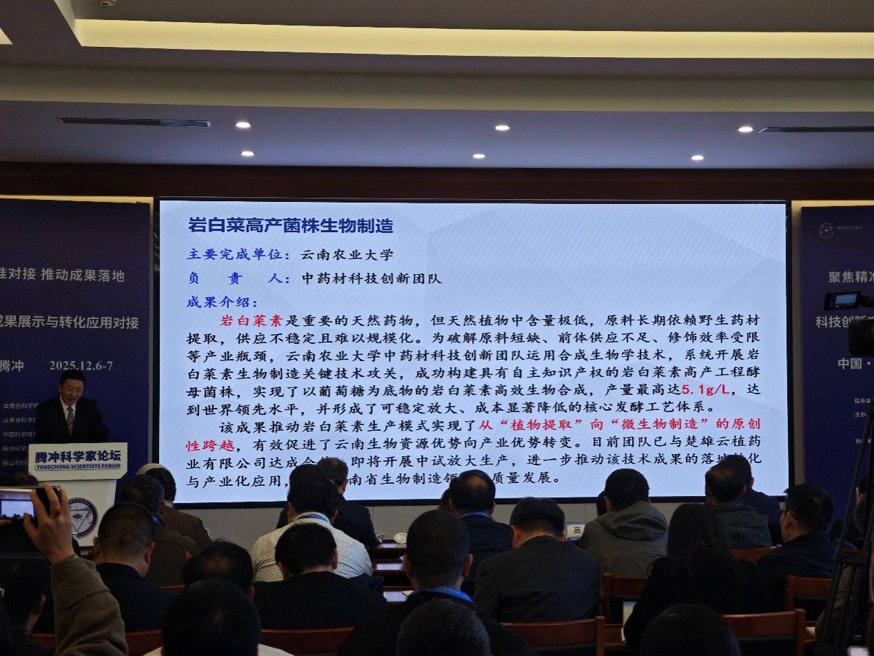 本站消息:在2025年12月6日腾冲科学家论坛开幕式上,西南中药材种质创新与利用国家地方联合工程研究中心(以下简称中心)的两项科技成果在“科技创新成果展示与转化应用对接”分论坛上转化应用,体现了中心科技服务产业发展的责任担当,彰显了科技创新对乡村振兴和生物医药产业的有力支撑。